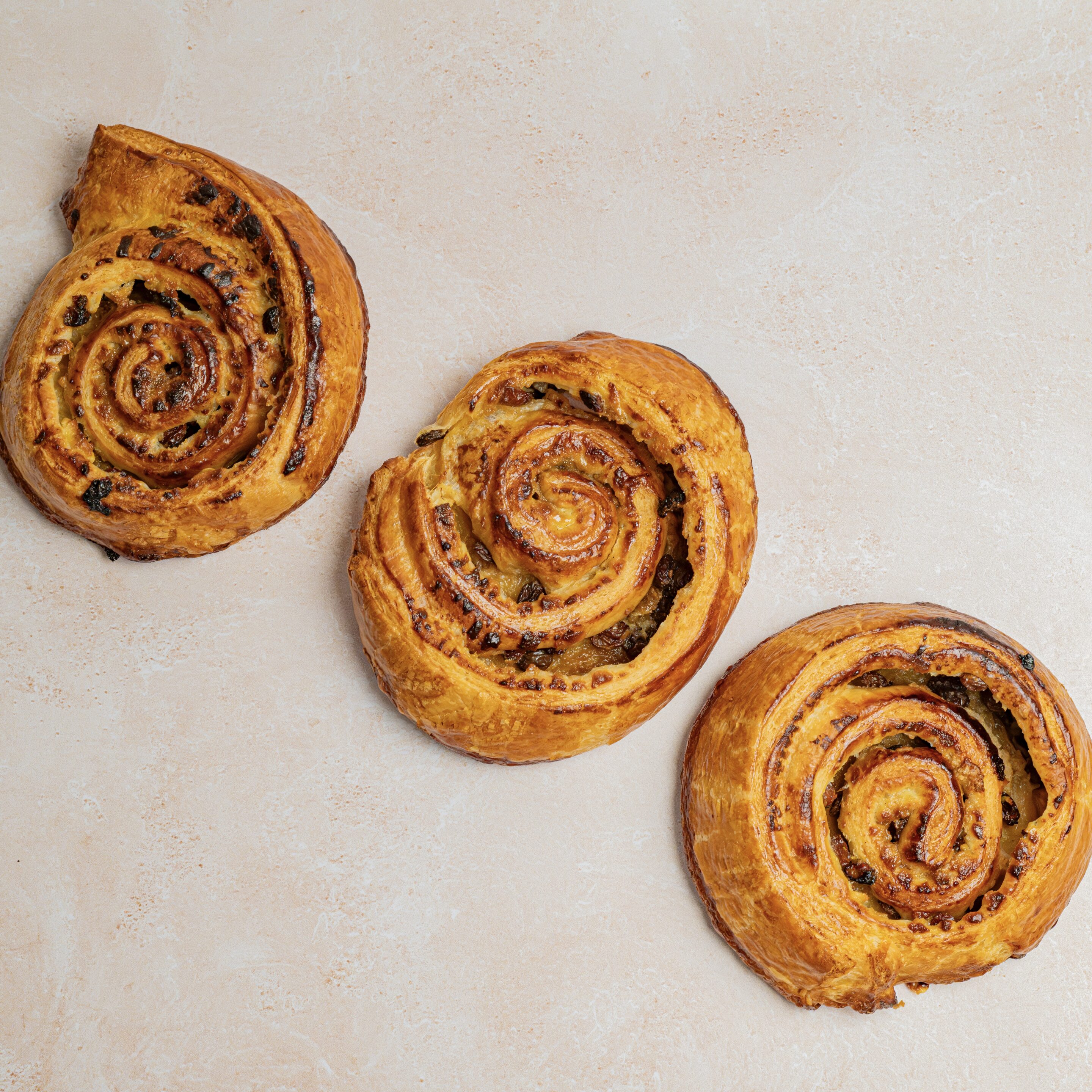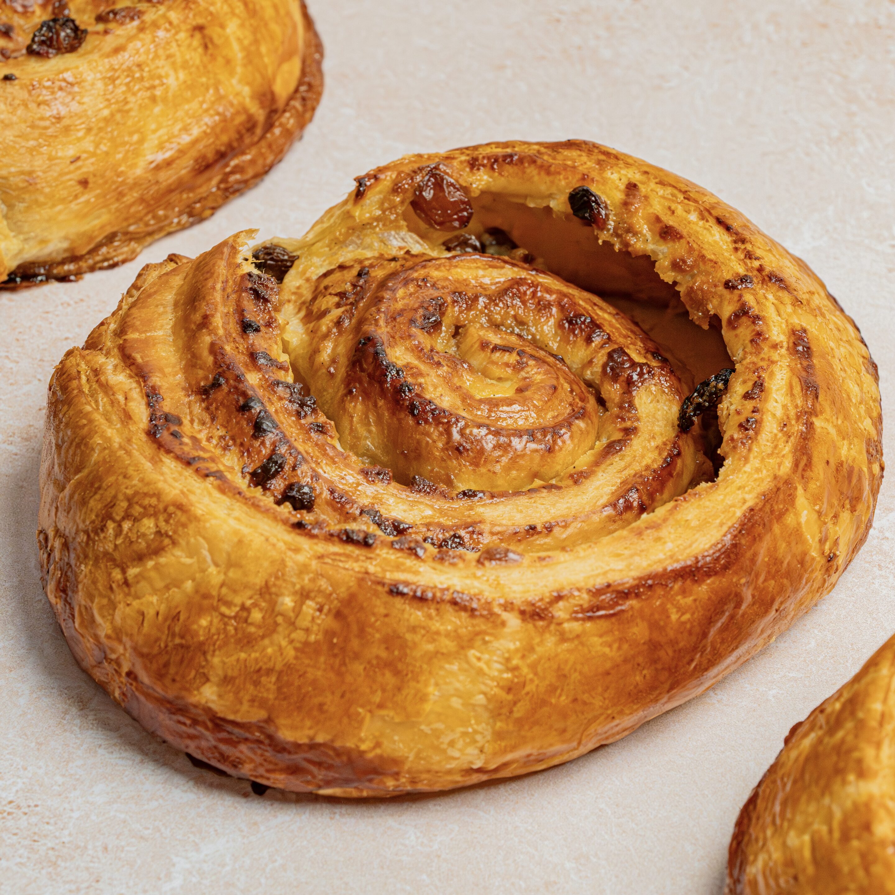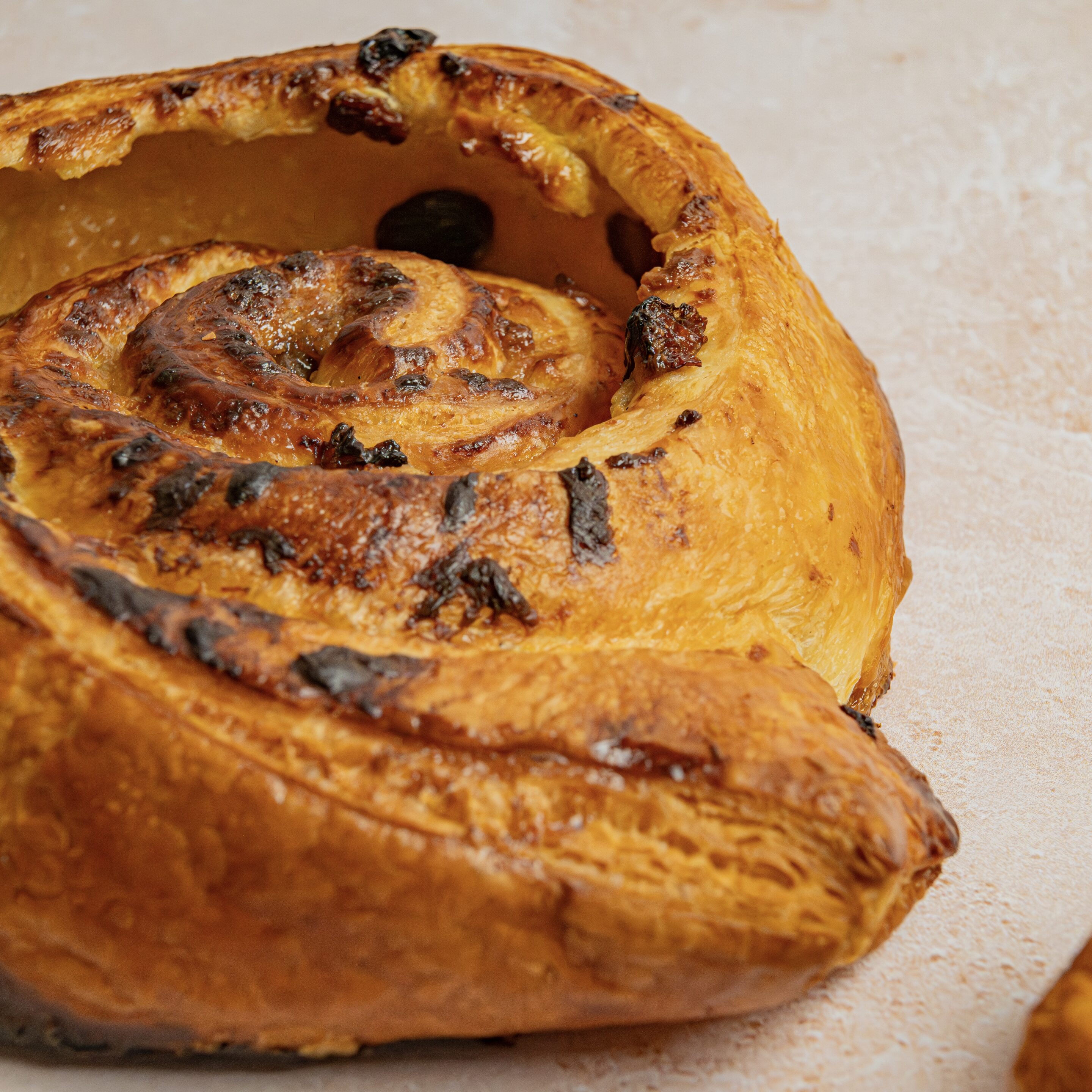 Feuilletage pur beurre, crème pâtissière, cassonade et raisins