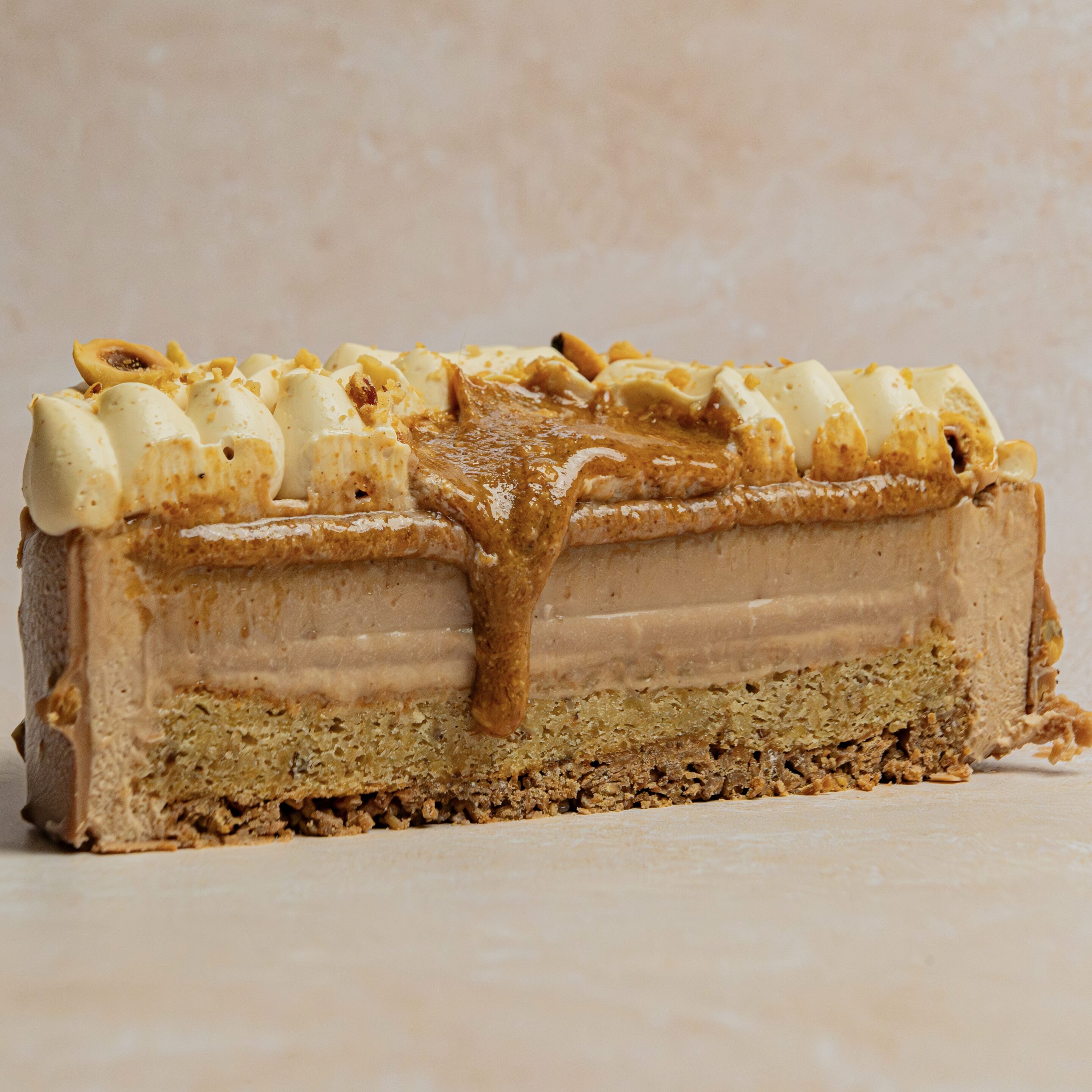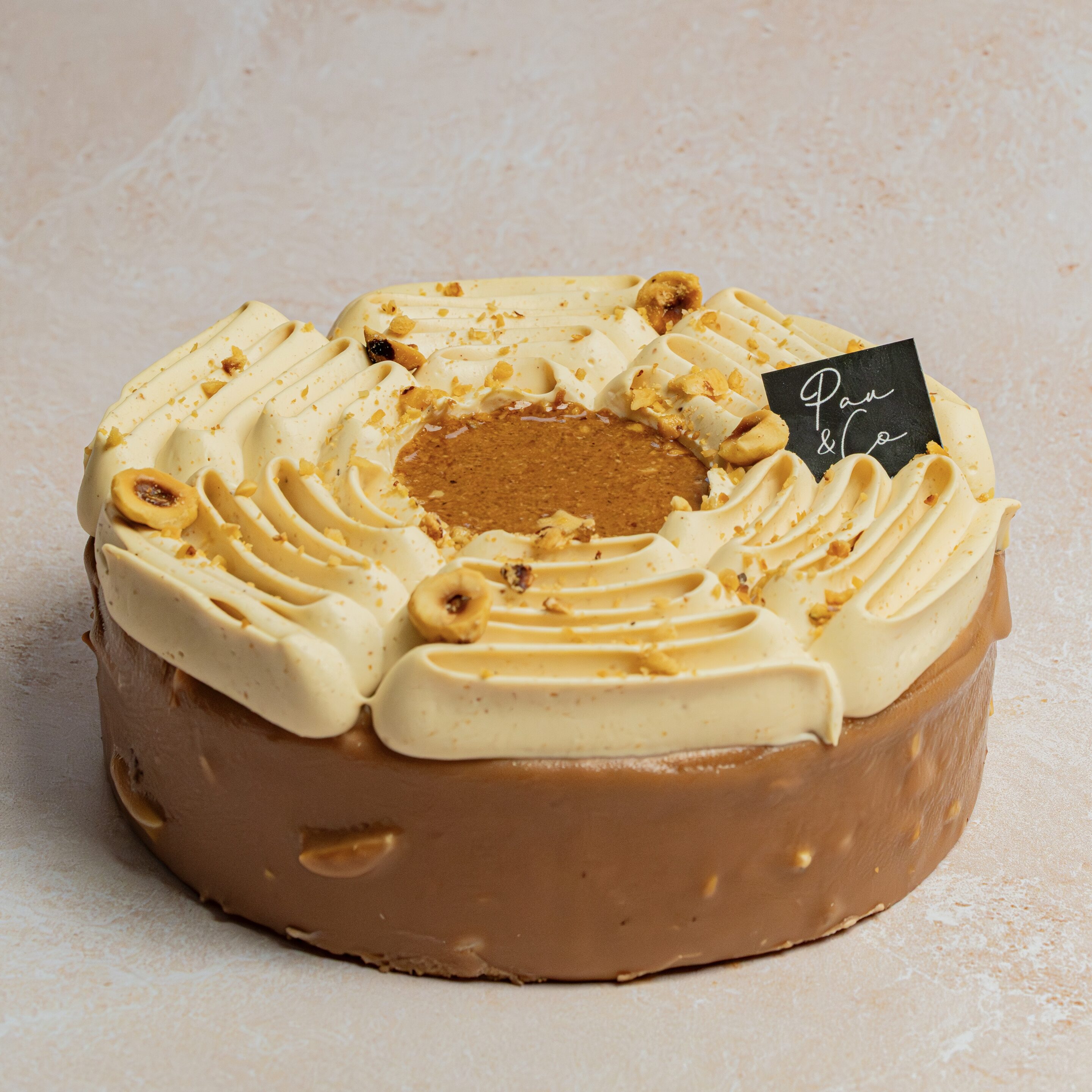 Mousse chocolat au lait, crémeux praliné noisette, praliné pur noisette, gel chocolat au lait, biscuit noisette, croustillant noisette, chantilly noisette. Conservation au frigo 2 à 3 jours, ne pas congeler Allergènes : Oeuf, lait, gluten, fruits à coques. Traces possible de soja, arachides, sésame.