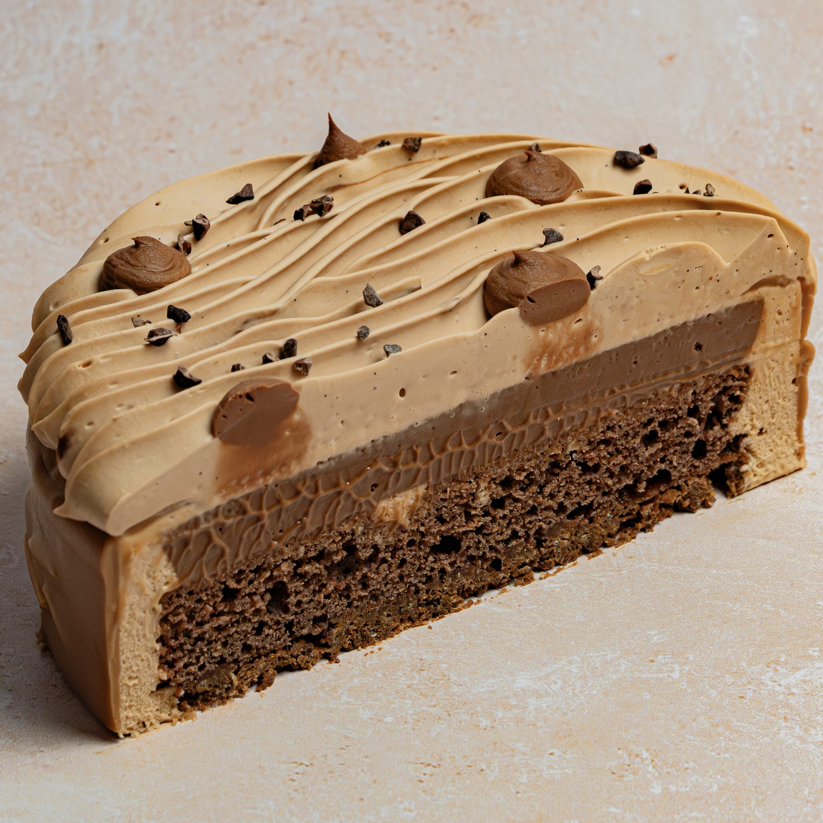 Croustillant et biscuit chocolat, crémeux chocolat noir, mousse chocolat au lait, enrobage craquant