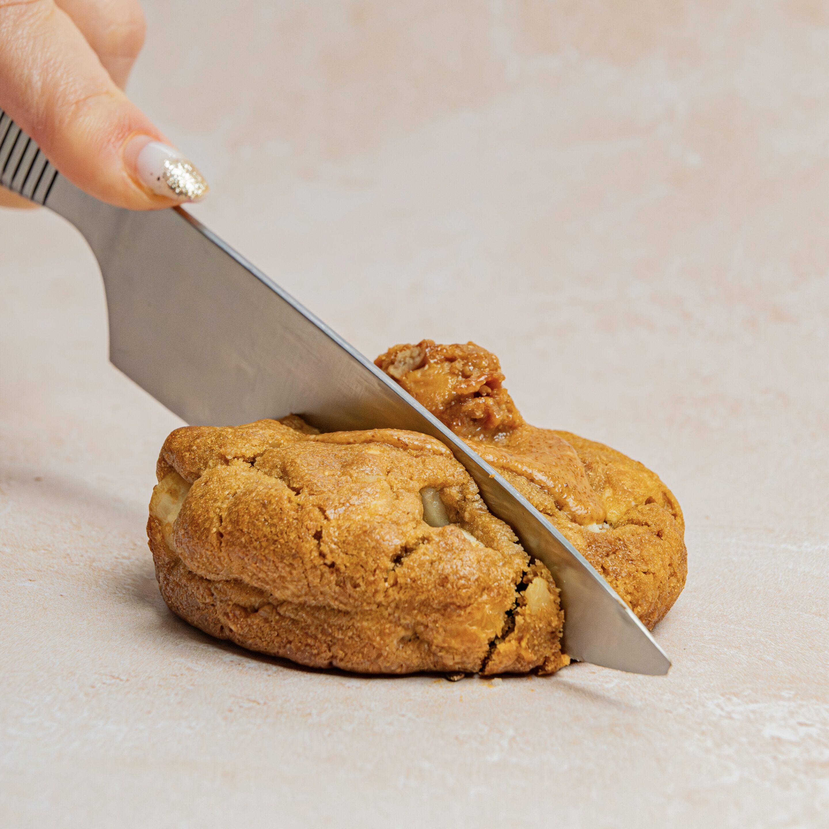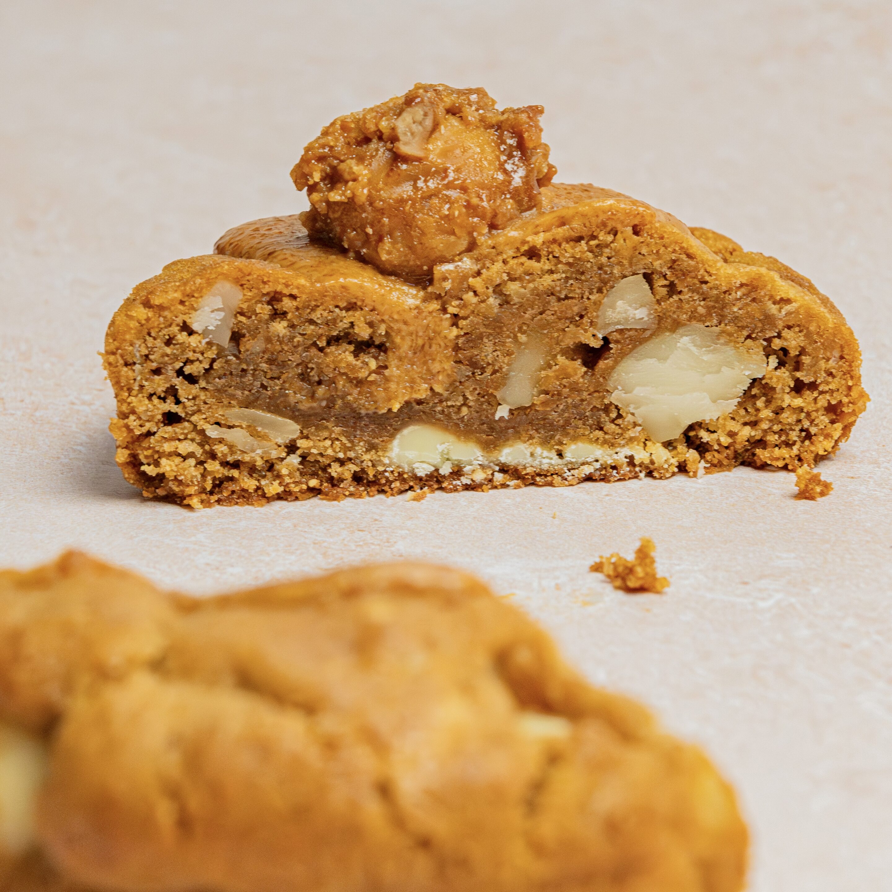 Pâte à cookies au chocolat blanc, praliné noix de macadamia et amandes, noix de macadamia concassées