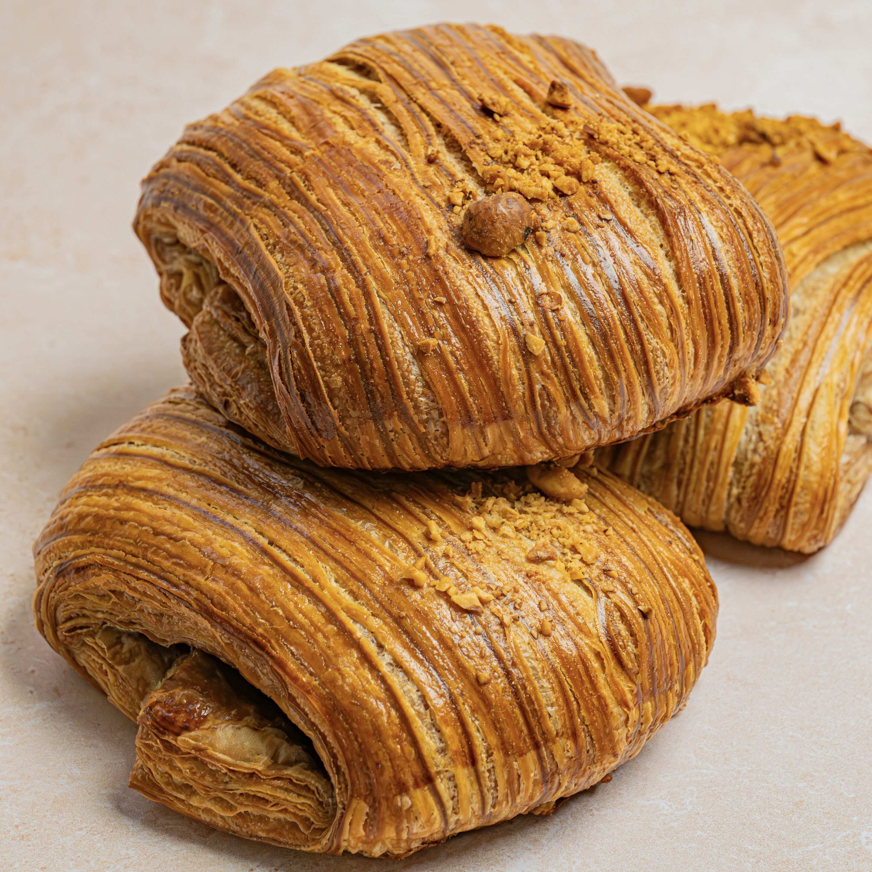 Feuilletage pur beurre, crème pâtissière, gianduja maison (mélange de noisettes et chocolat au lait).