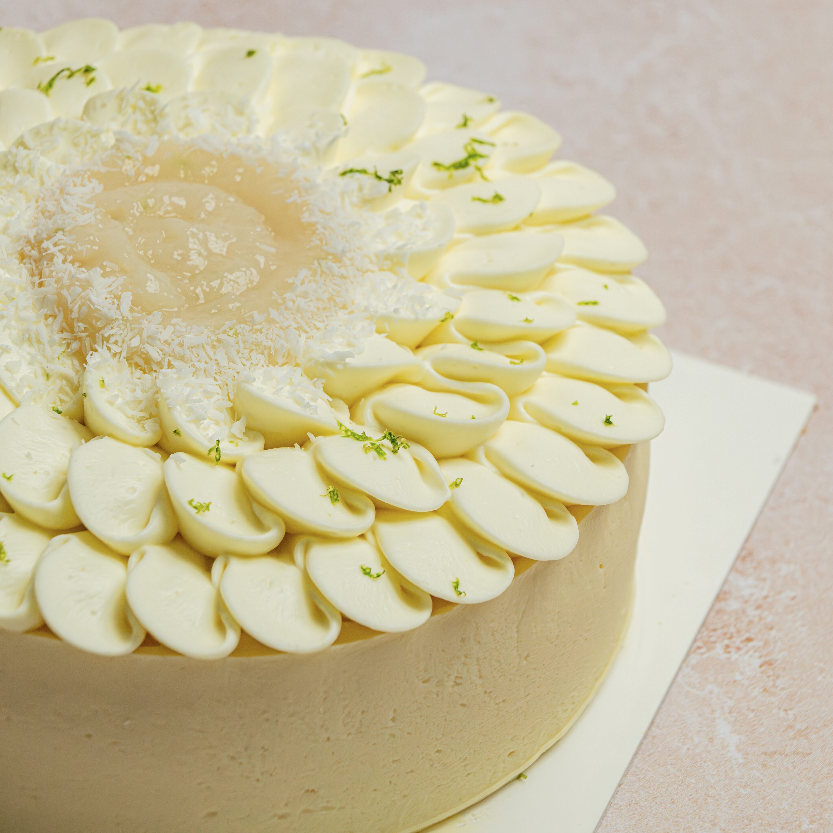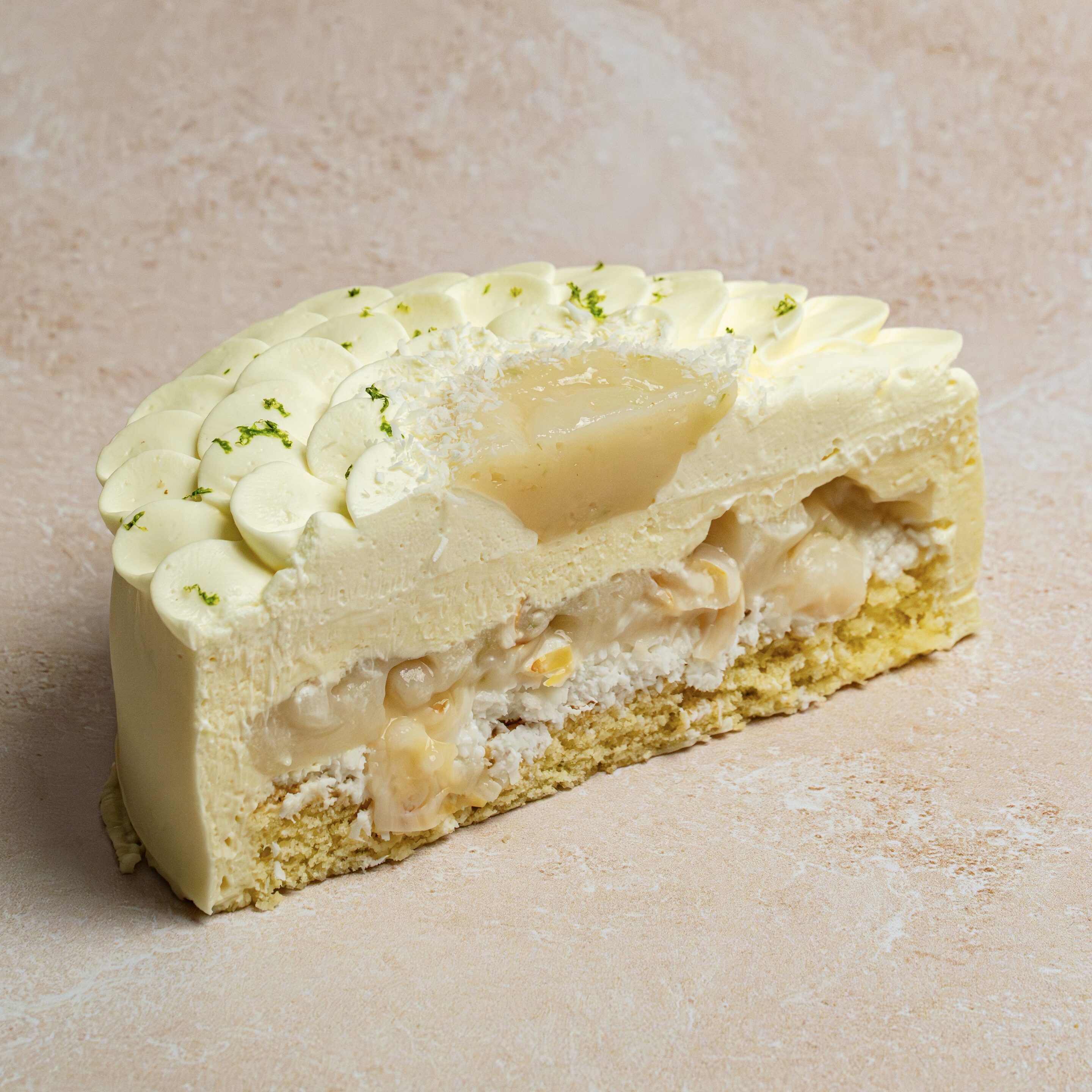 Mousse coco, gel litchi au zestes de citron vert, morceaux de litchi, crème bounty, biscuit madeleine, chantilly coco.