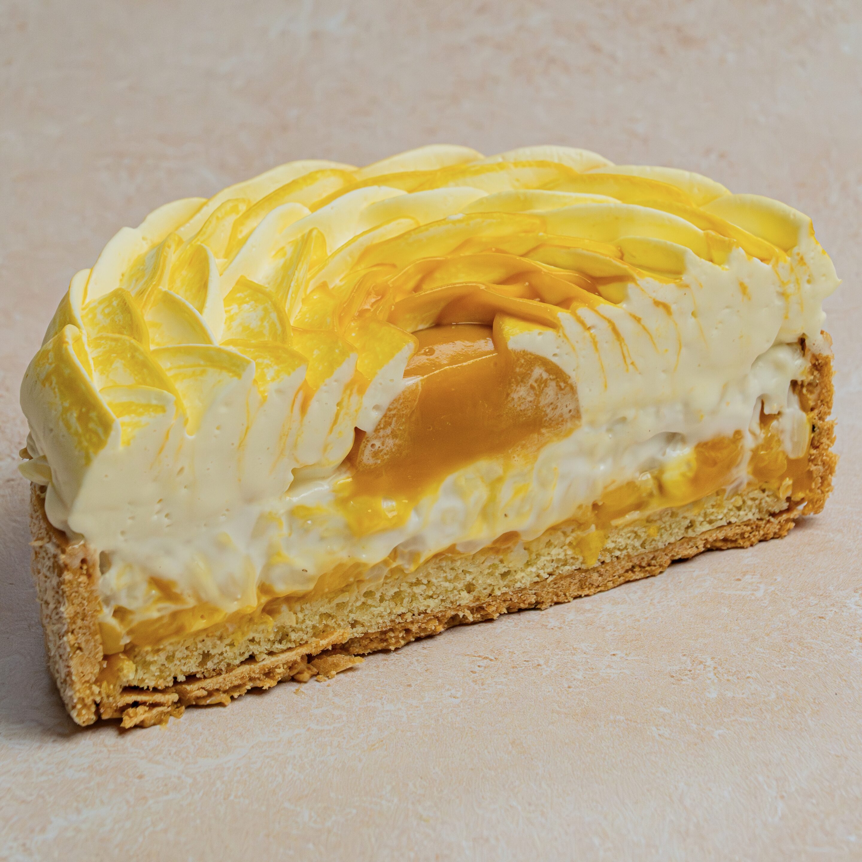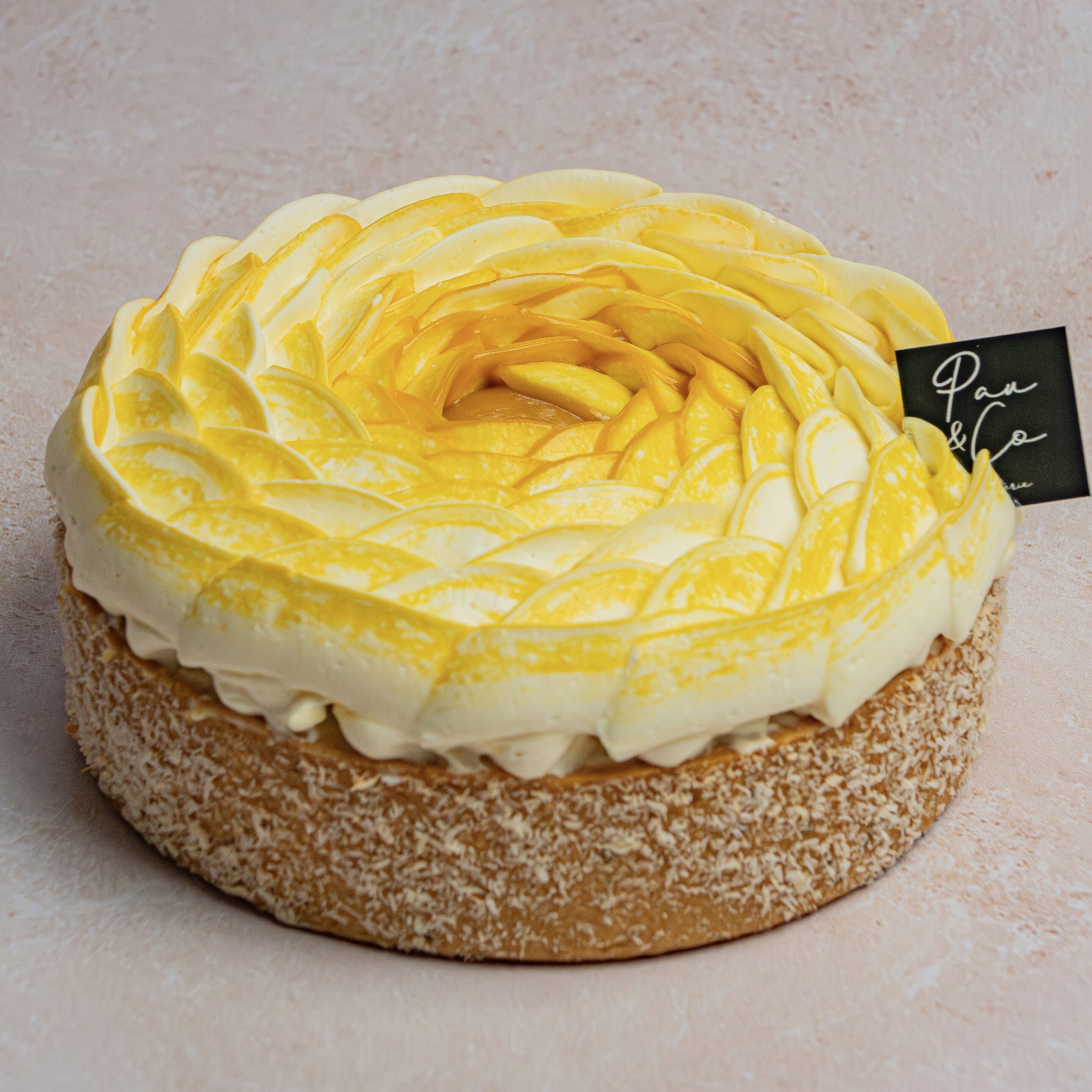 Pâte sablée enrobée de coco, biscuit madeleine, gel mangue et une touche de passion, mangue fraiche, riz au lait de coco, chantilly coco.