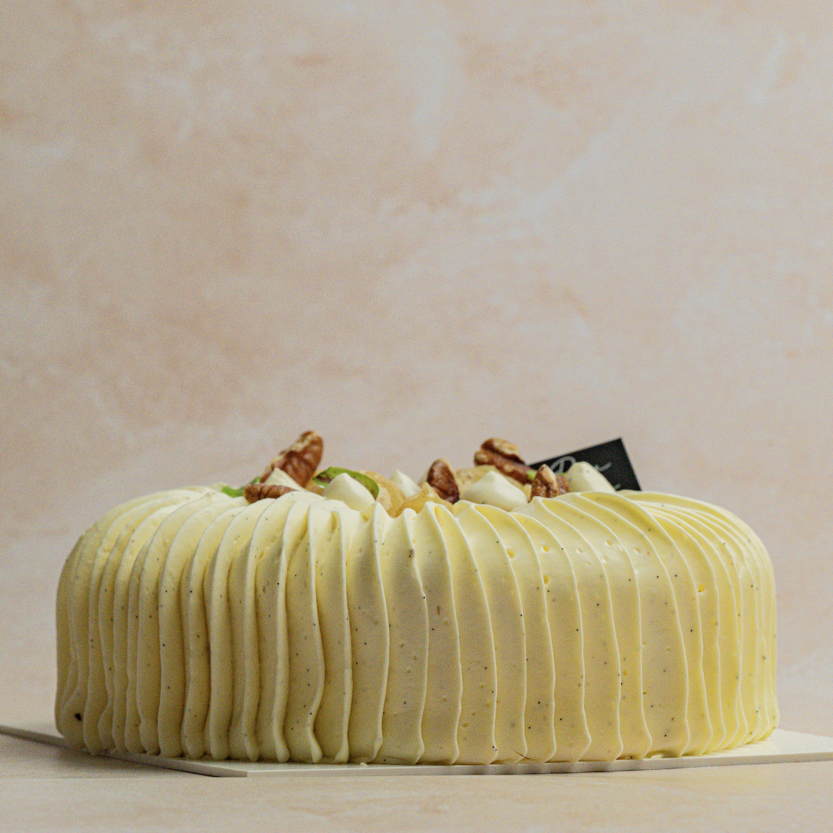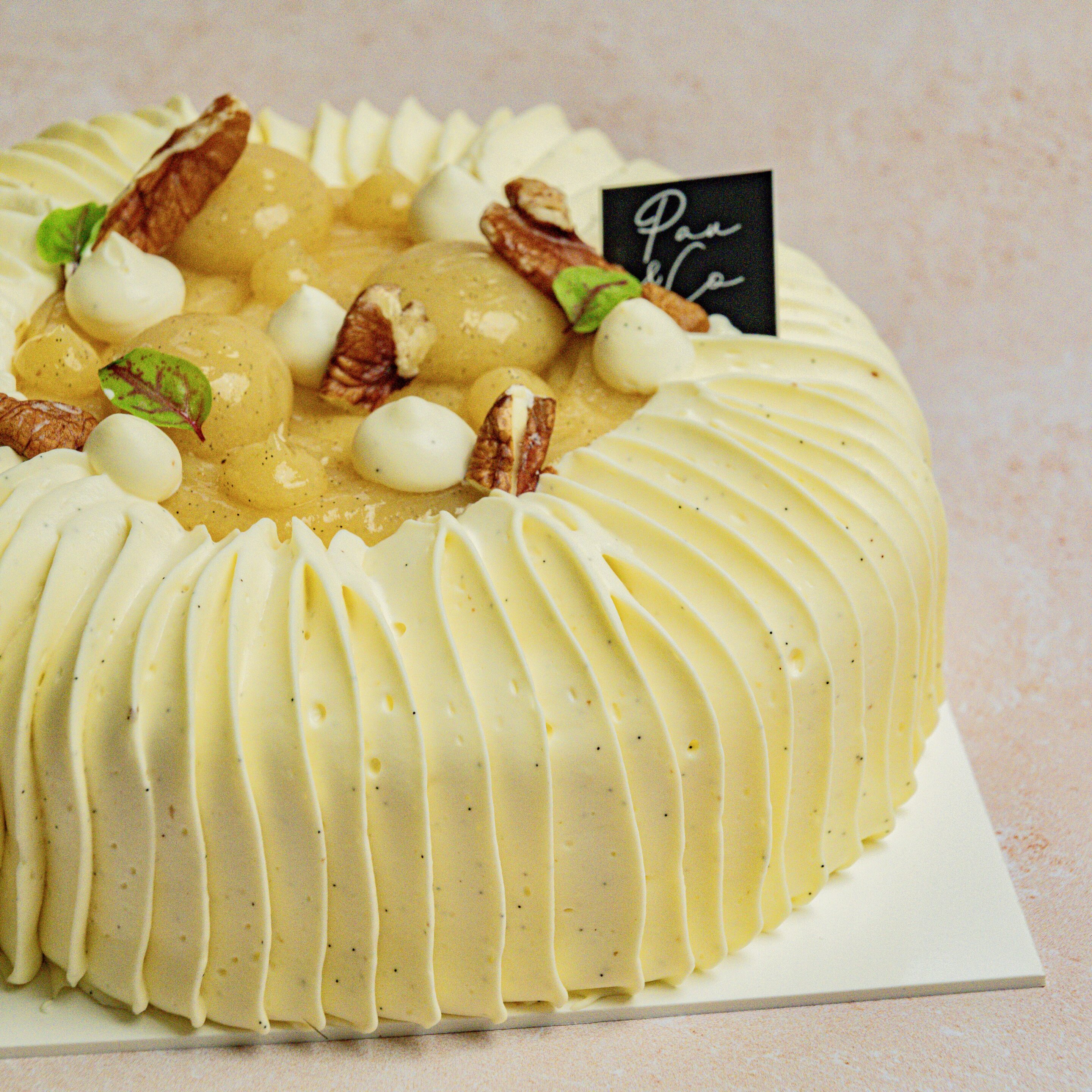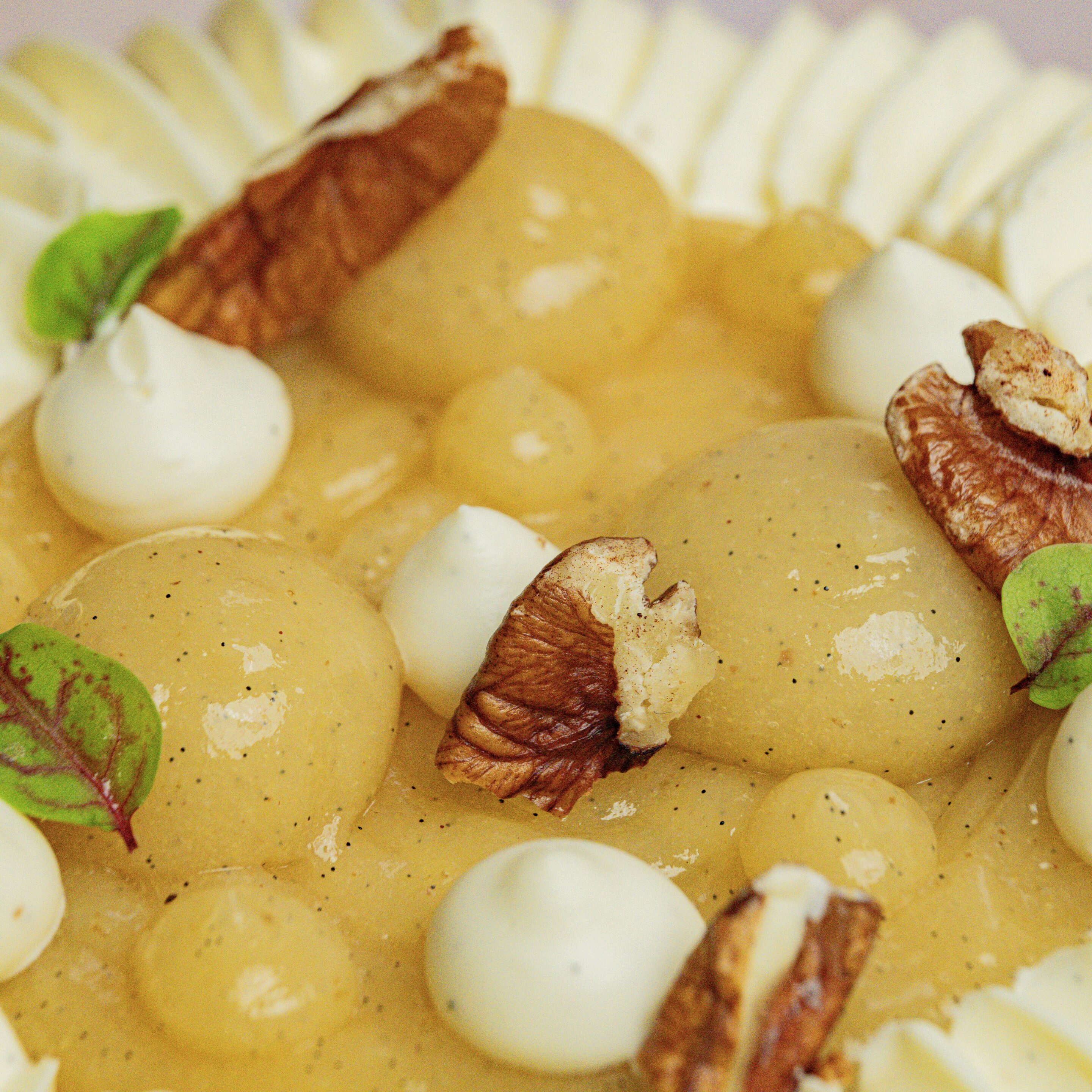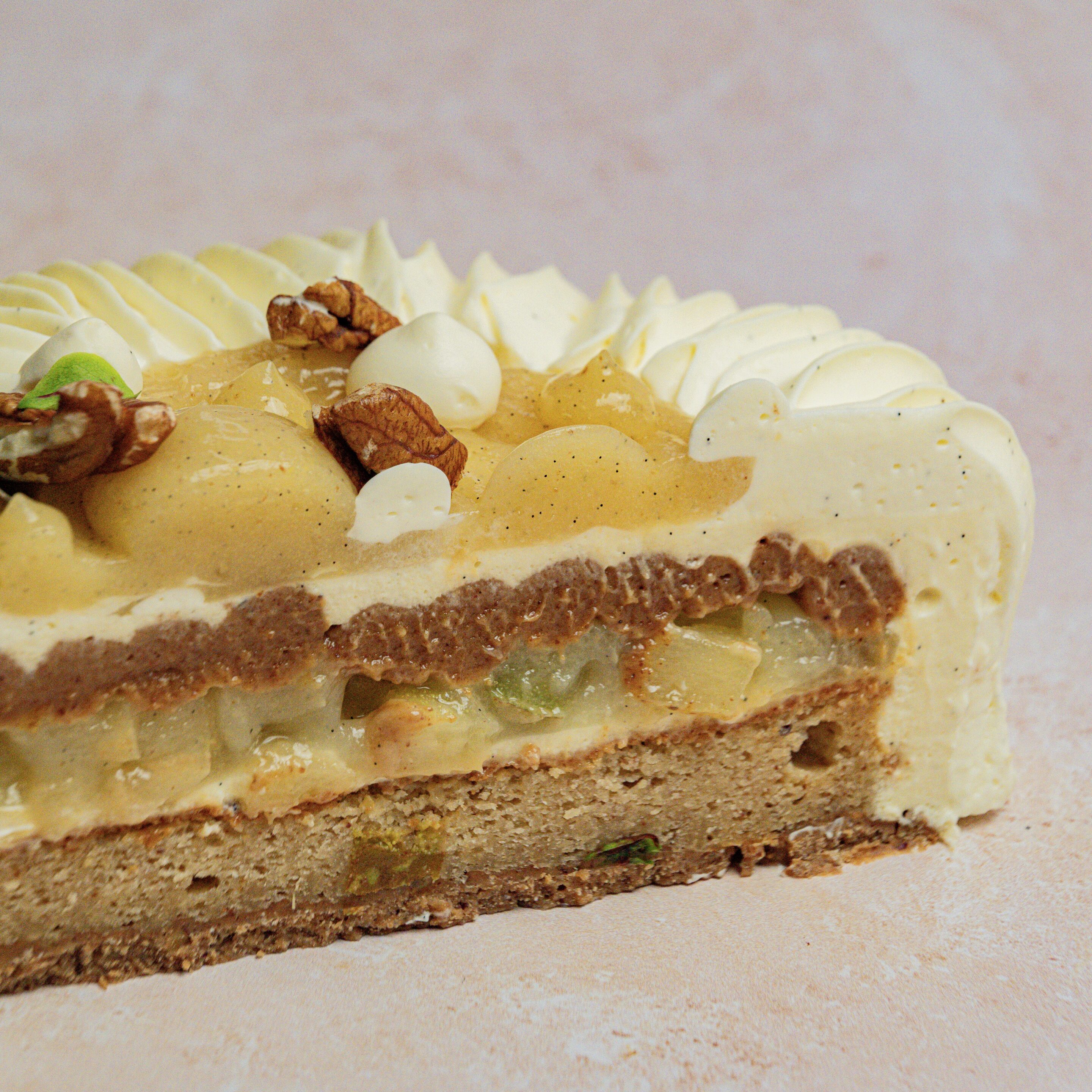 Mousse vanille, crémeux pécan, gel poire vanille, morceaux de poire fraiches et confites, biscuit pécan, croustillant pécan, chantilly vanille.